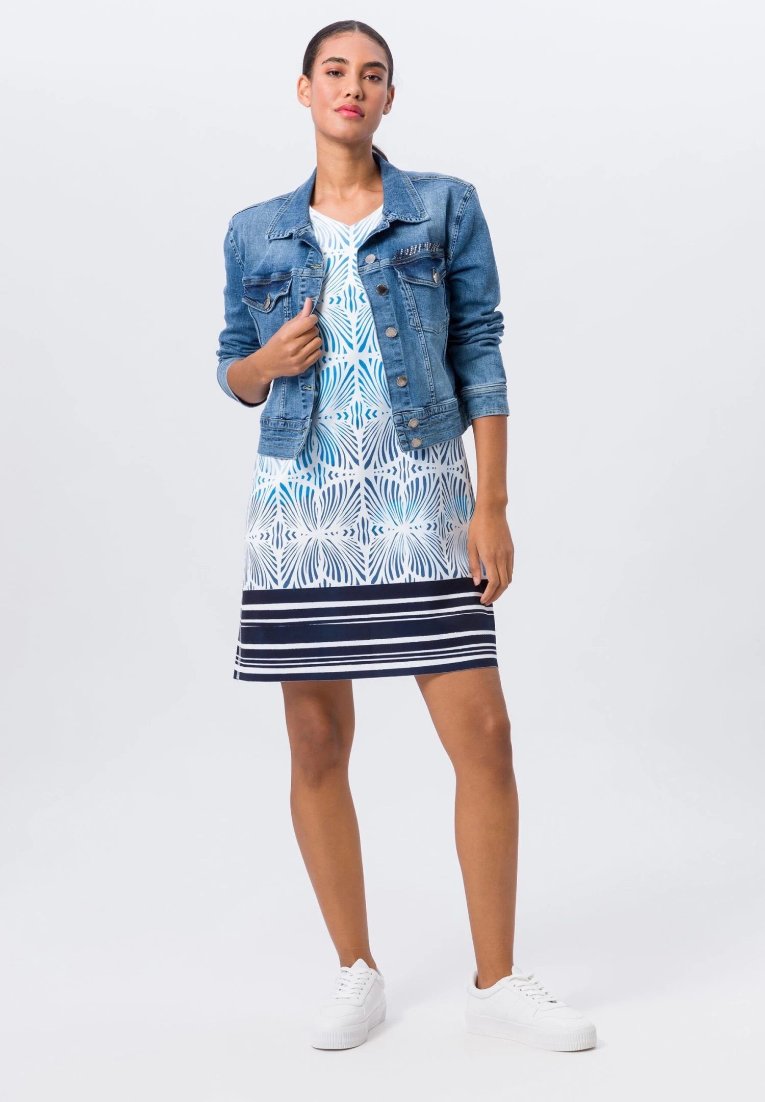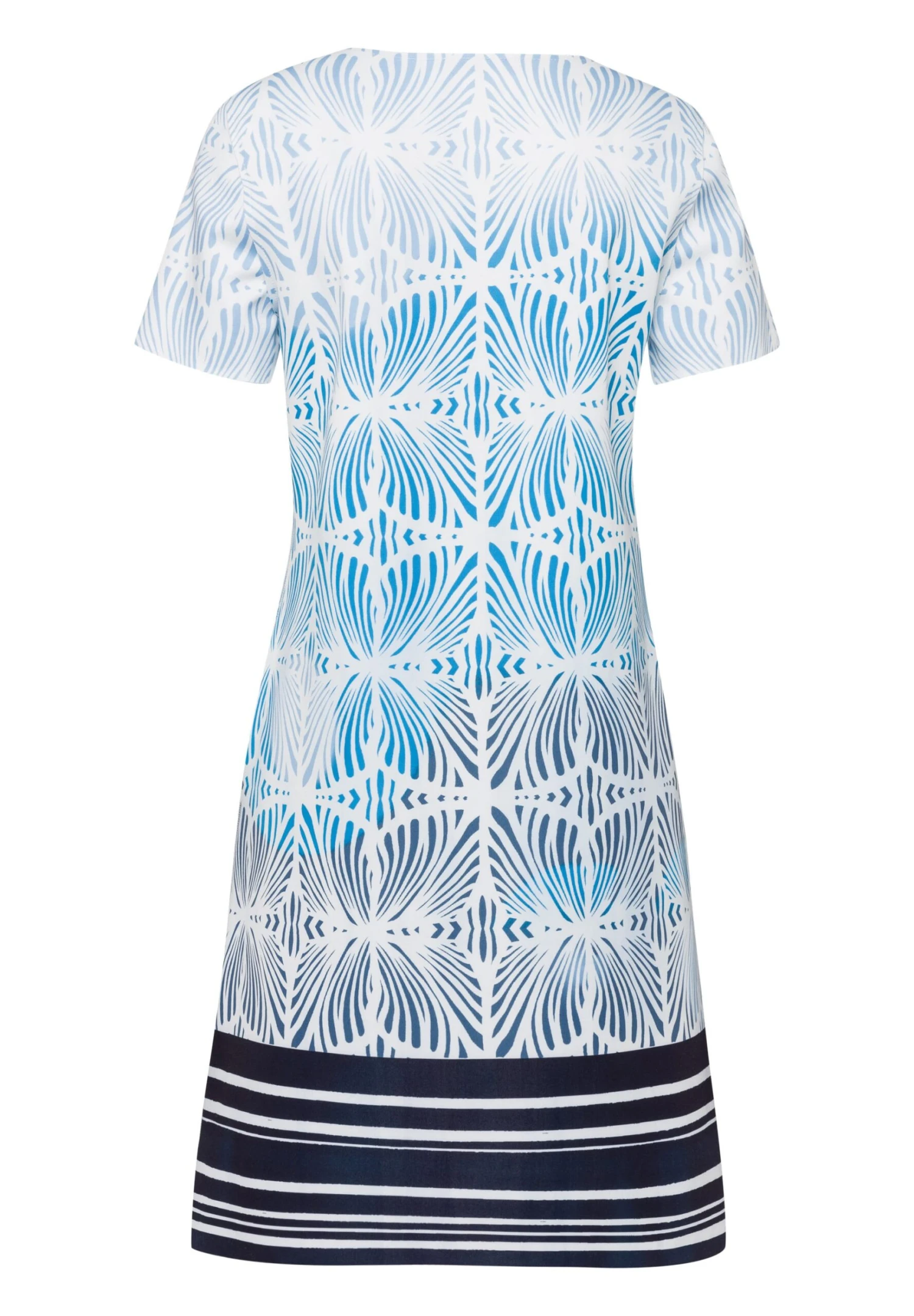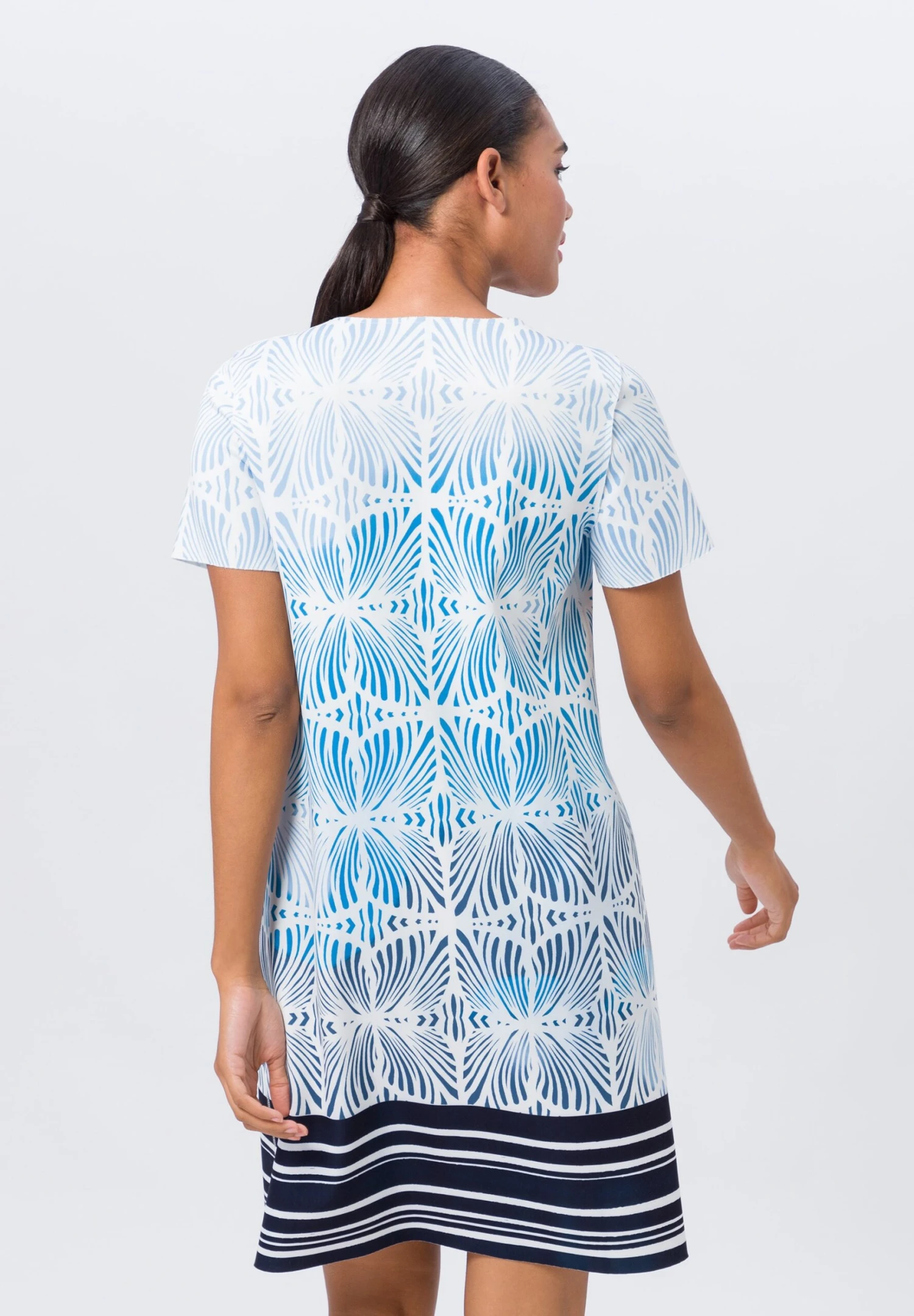 Mit diesem Kleid zieht frau sich ein Lebensgefühl an. Die pflegeleichte und knitterarme Jerseyqualität schenkt ein unbeschwertes Komforterlebnis und durch den Stretchfaktor auch jede Menge Bewegungsfreiheit. Modischer Clou: die Wendefunktion mit zwei unterschiedlichen Alloverprints. Eyecatcher sind ebenfalls die Inside-out-Nähte und die geschnittenen Saumkanten.