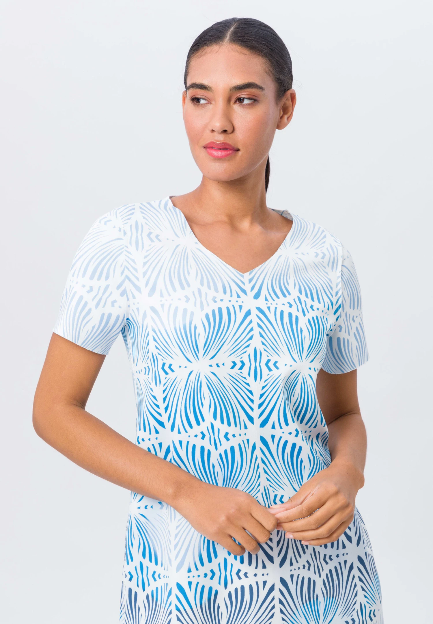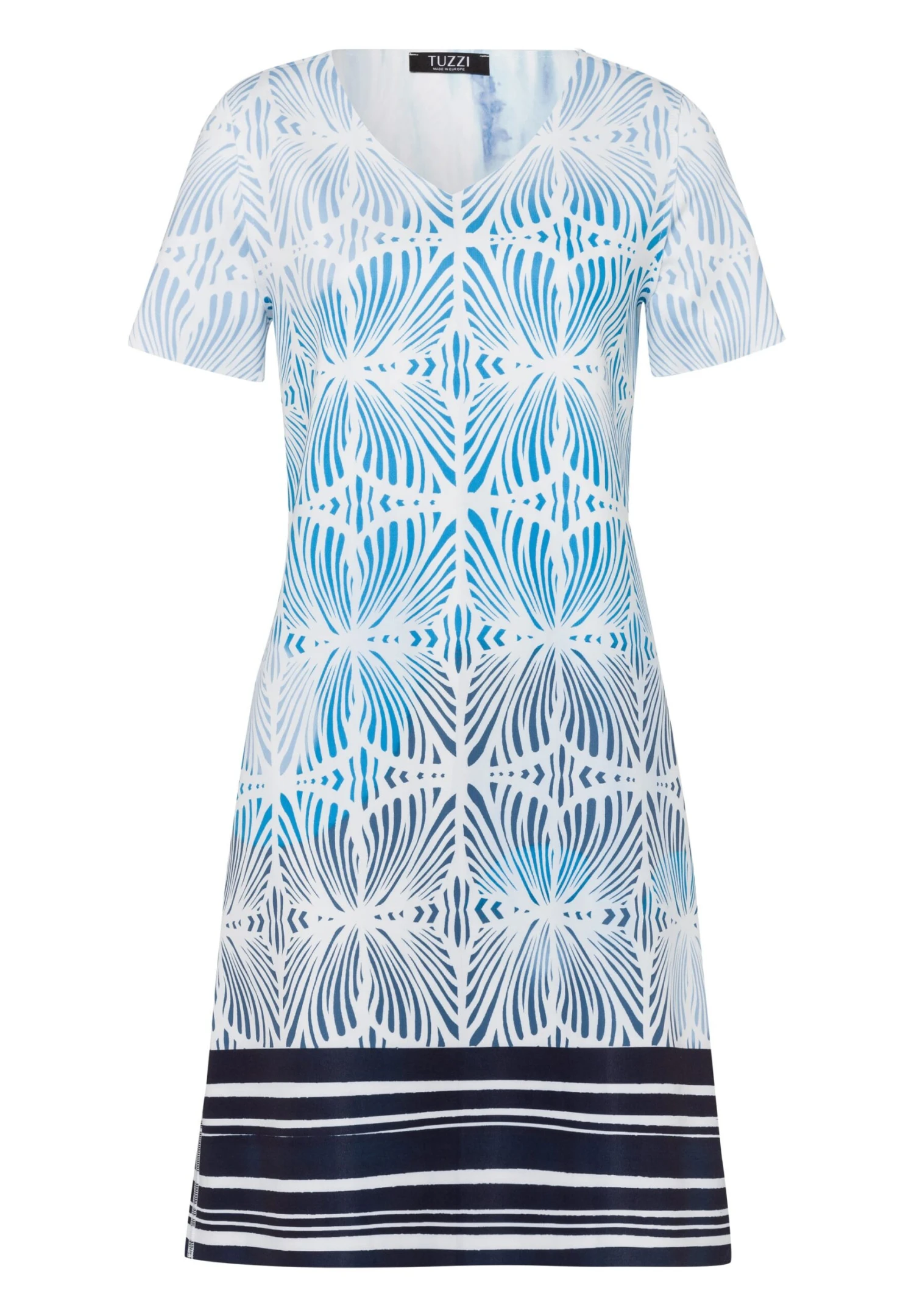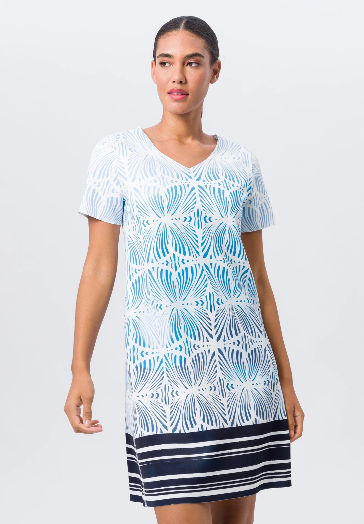 Mit diesem Kleid zieht frau sich ein Lebensgefühl an. Die pflegeleichte und knitterarme Jerseyqualität schenkt ein unbeschwertes Komforterlebnis und durch den Stretchfaktor auch jede Menge Bewegungsfreiheit. Modischer Clou: die Wendefunktion mit zwei unterschiedlichen Alloverprints. Eyecatcher sind ebenfalls die Inside-out-Nähte und die geschnittenen Saumkanten.
